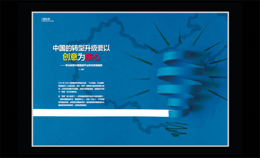 一本以信息服务业、动漫游戏业、设计服务业、现代传媒业、艺术品业、教育培训业、文化休闲旅游业、文化会展业等文创产业八大重点发展行业为宣传重点的刊物。《创意中国》致力于把世界珍奇的创意人才的创造力、创造技能和创意知识产权、具有远见卓识的金融资本与中国县域无所不在的自然、生态、经济、社会、文化资源进行深度融合与无缝对接,在广袤的中国大地上碰撞出震撼心灵、光耀神州的创意火花,从而创造、延伸出无限的产业、无限的财富,为创意中国点赞。