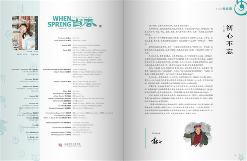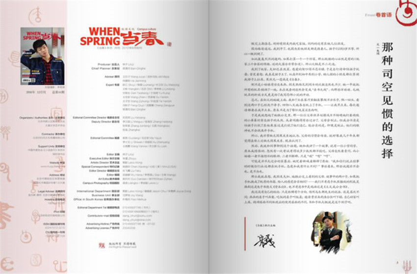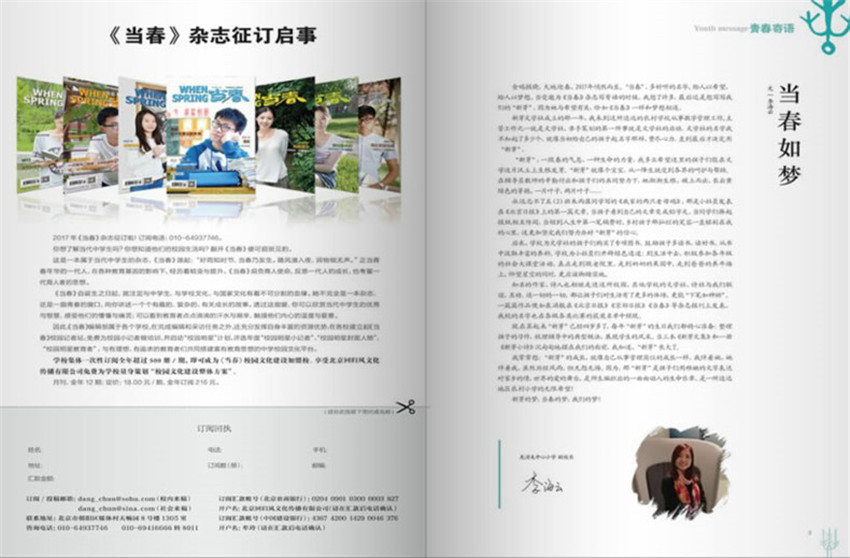 《当春》杂志是全国面对我国中学及中学生、有国家正规刊号且充分展现中学校园文化生活的月刊,是由北京顺义区教委与北京回归风文化传播有限公司联合出品,由北京回归风期刊运营部承担策划、编辑、排版、装帧设计、宣传发行