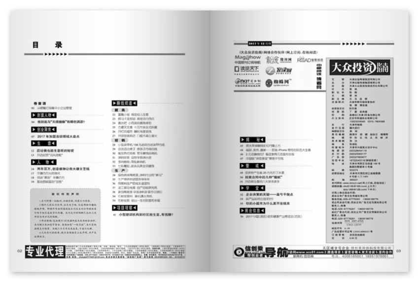 更加注重深入研究中小投资市场规律,总结十多年办刊经验,汇总成千上万的读者需求,打破了以往的内容安排和栏目设计,将以新面孔奉献给广大读者,通过对投资领域的热点难点问题深入地报道和研究,为小企业和创业人士寻找更丰富、更真实、更可行的财富之源,紧抱投资,心向指南,是中小投资创业者早日走上富裕阶层的良师益友。广告赠页信息量大,为投资者提供各种投资资讯,致富信息。