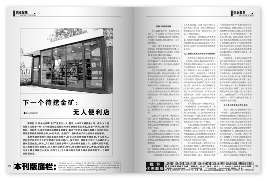 下一个待挖金矿:无人便利店,面积约10平米的玻璃“盒子”里空无一人,整洁、冰冷而又科技感十足。店内,4个监控探头注视着一切,三个摆满物品的货架和冰柜静待顾客的光临,这是一间无人值守的商店。扫码进门,没有收银员略显疲惫的微笑,取而代之的是收银机屏幕上闪出的白光,顾客选取货品到扫码结账,20秒完成,走到门口,便利店舱门自动打开并感谢惠顾。