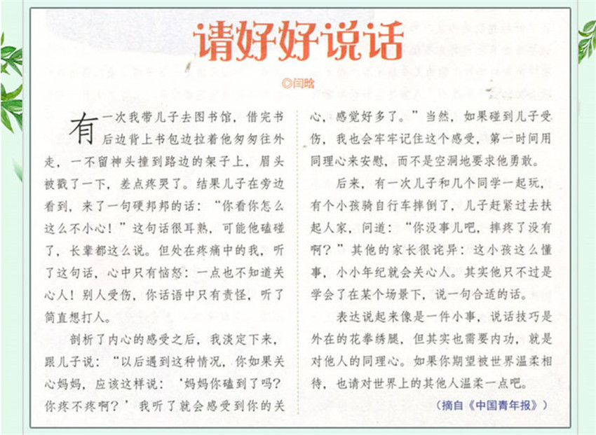 动物牙齿趣闻,有后边背上书包边拉着他匆匆往外走,一不留神头撞到路边的架子上,眉头被戳了一下,差点疼哭了。结果儿子在旁边看到,来了一句硬邦邦的话:“你看你怎 么这么不小心!”这句话很耳熟,可能他磕碰了,长辈都这么说。但处在疼痛中的我,听了这句话,心中只有恼怒:一点也不知道关心人!别人受伤,你话语中只有责怪,听了简直想打人。