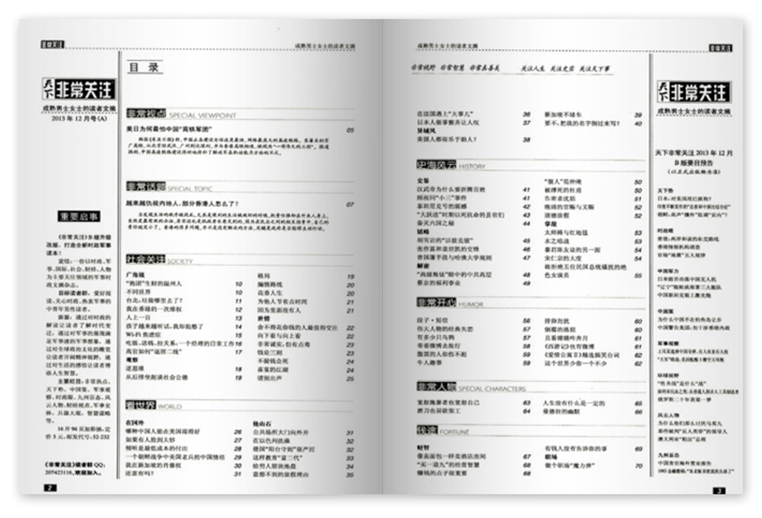 既有当今时政热点、又有家长里短;既有严肃的社会问题,又有轻松地中外逸事,既放眼看世界,有追古问今,内容有非常视野、非常悦读、非常真善美,关注社会、关注人生、关注天下事,目前期发量6万左右,在文摘市场占有一席之地。