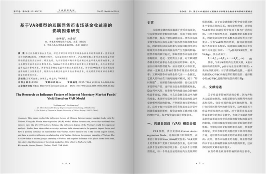 基于VAR模型的互联网货币市场基金收益率的影响因素研究。本文以余额宝基金为代表,研究中国互联网货币市场基金收益率的影响因素。使用向量自回归(VAR)模型,对Shibor利率、七日国债逆回购利率、沪深300指数三者对余额宝收益率的影响程度进行实证分析。