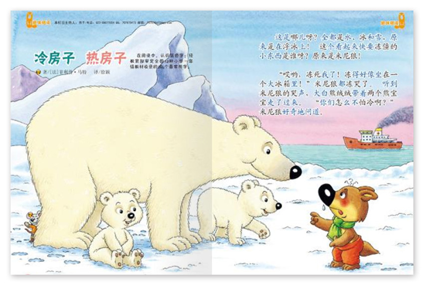 这是哪儿呀? 全都是水、冰和雪。原来是在浮冰上! 这个看起来快要冻僵的,小东西是谁呀?原来是米尼狼!“哎哟,冻死我了!冻得好像坐在一个大冰箱里!”米尼狠都冻哭了。听到米尼狼的哭声,大白熊绒绒带着两个熊宝宝走了过来,“你们怎么 不怕冷啊?”米尼狼好奇地问道。