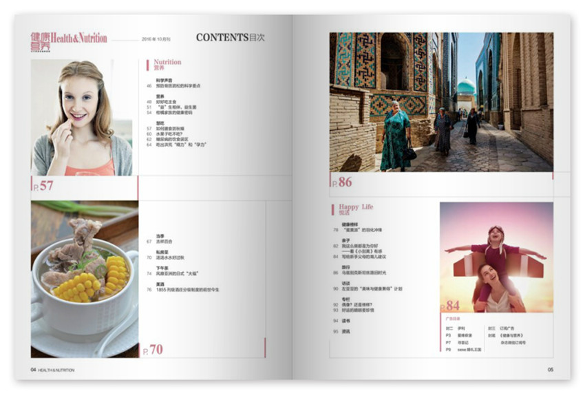 把握潮流理念,分享健康生活方式,提供多方位营养资讯,关爱精英生活,推动健康升级,着力打造健康、自由的生活理念,以最快的速度,以最专业的手法,较大化地为客户和读者创造价值,主要栏目:我们推荐,科学声音,健康榜样,大厨上菜,以提升健康素养为己任,并与卫生系统机构中国疾病预防控制中心联合开设专题栏目,面向城市精英普及营养科学的杂志。
