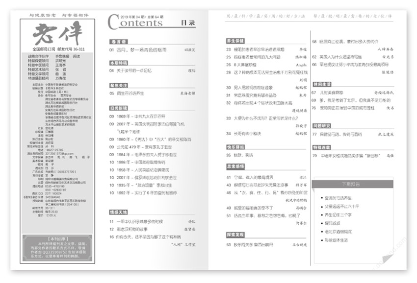 《老伴》主要栏目:本期话题、信息速递、情感天地、长寿之乡、快乐驿站、银族广角等。