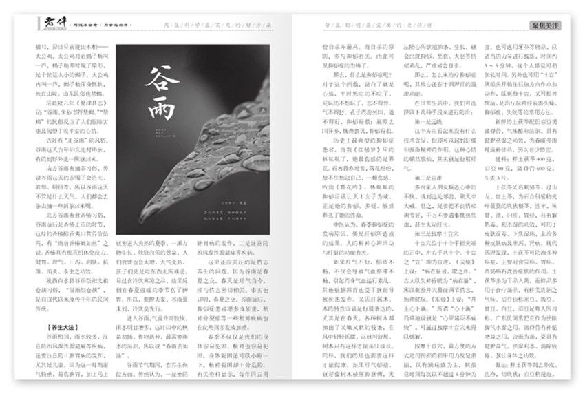 古时有“走谷雨”的风俗,谷雨这天青年妇女走村串亲,有的到野外走一圈就回来,南方谷雨有摘茶习俗,传说谷雨这天的茶喝了会清火、辟邪、明目等。所以谷雨这天不管是什么天气,人们都会去茶山摘一些新茶回来喝,北方谷雨有食香椿习俗,谷雨前后是香椿上市的时节,这时的香椿醇香爽口营养价值高,有“雨前香椿嫩如丝”之说。香椿具有提高机体免疫力,健胃、理气、止泻、润肤、抗菌、消炎、杀蛇功效。