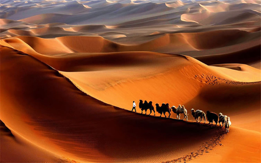 塔克拉玛干沙漠位于新疆南疆的塔里木盆地中心,是中国较大的沙漠,也是世界第十大沙漠,同时亦是世界第二大流动沙漠。这里,金字塔形的沙丘屹立于平原以上300米。狂风能将沙墙吹起,高度可达其3倍。沙漠里沙丘绵延,受风的影响,沙丘时常移动。沙漠里亦有少量的植物,其根系异常发达,超过地上部分的几十倍乃至上百倍,以便汲取地下的水分,那里的动物有夏眠的现象。