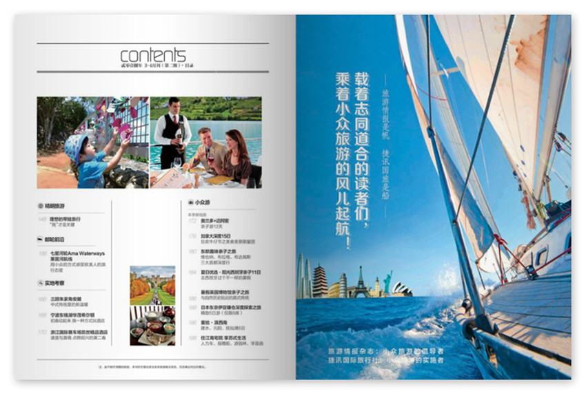 为大家推荐当季新的自驾游线路,值得体验的精品度假酒店,优惠的团队线路,当然,还有令人神往的邮轮旅行,紧抓“旅游”与“信息”两大主题,针对读者对旅游度假产品的实际需求,将可读性、指导性、可操作行、服务性融为一体,主要栏目:周边游、酒店、小众游、本季新线路、我的导游、精明旅游等。