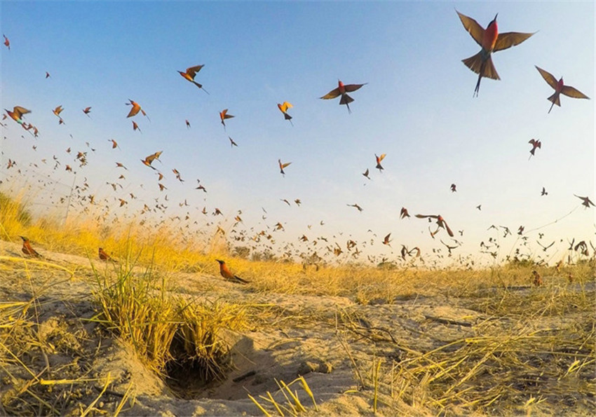在纳米比亚的赞比西河,无以计数的深红色的食蜂鸟(南红蜂虎)冲上蓝天。你来掌镜摄影师JasonBoswell说:“”当时一组人正想为几百只食蜂鸟做标记,以了解它们离开这片土壤后去了哪里。为了躲避人群,鸟儿纷纷起飞,所以才有了这一幕。”今天是美国国家爱鸟节,这个节日正好碰上一个由市民为了观察统计国内鸟类健康状况而发起的项目——圣诞节鸟类数量统计。