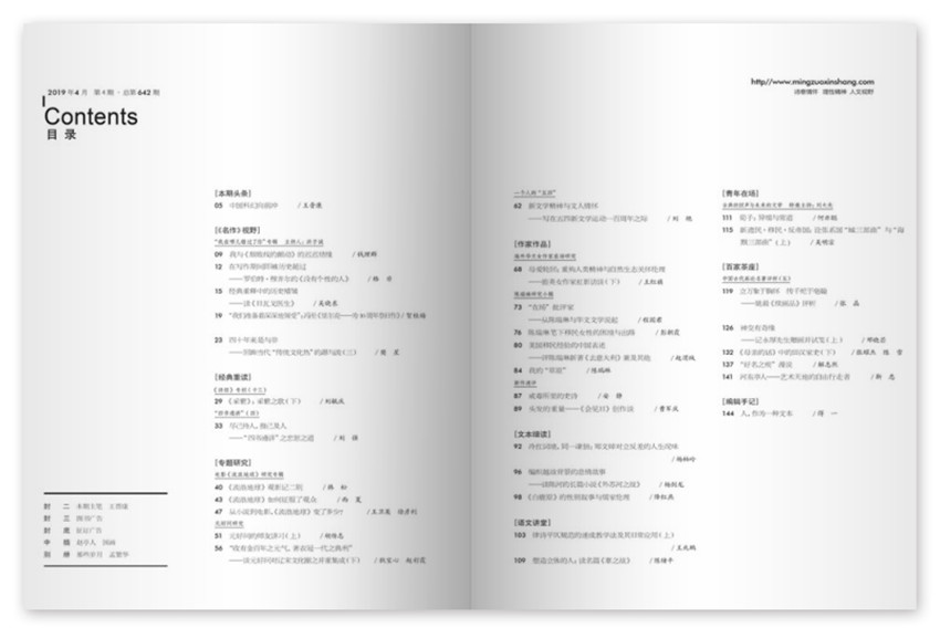 《名作欣赏》主要栏目:名作养心、名家在线、美文悦目、时文抢鲜、古典今读、域外视野、好书共享、妙笔生花等。