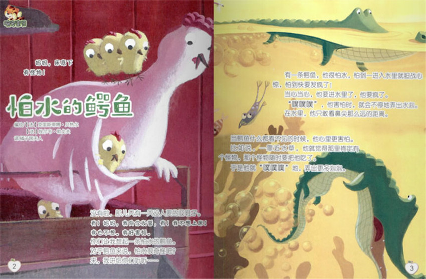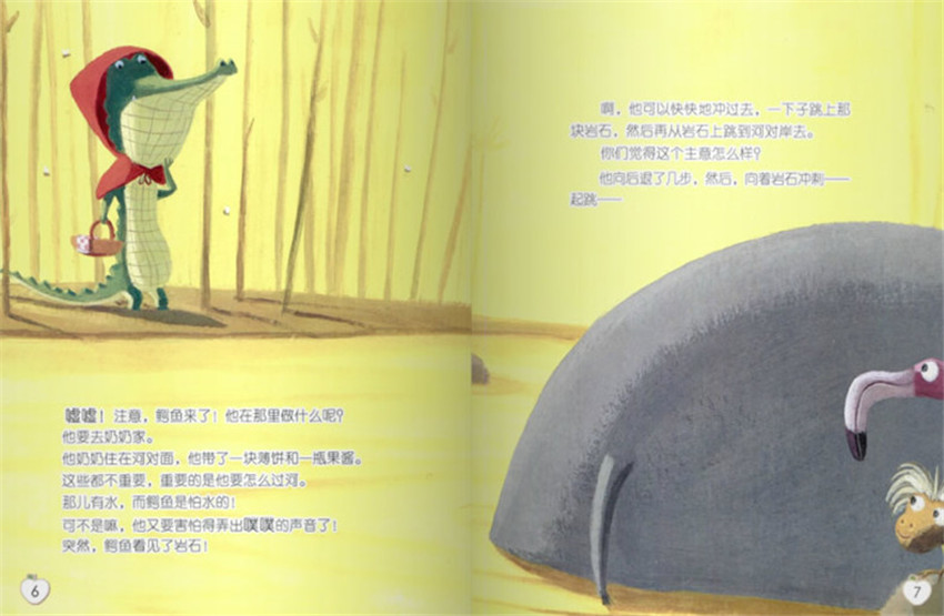 嘘嘘!注意,鳄鱼来了!他在那里做什么呢?他要去奶奶家,他奶奶住在河对面,他带了一块薄饼和一瓶果酱。这些都不重要,重要的是他要怎么过河。那儿有水,而鳄鱼是怕水的!可不是嘛,他又要害怕得弄出噗噗的声音了!突然,鳄鱼看见了岩石!