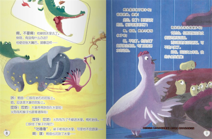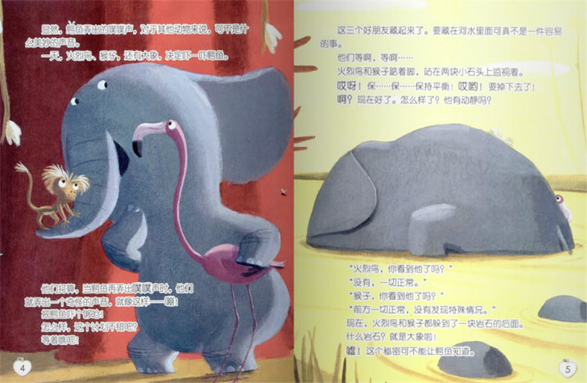 咔!鳄鱼一口咬在岩石的屁股上。呃,应该是大象的屁股上。哎呀!哎哟!大象疼得跌倒在水里啦!火烈鸟和猴子也跟着遭殃啦!哎呀!哎哟!火烈鸟为了不掉进水里,慌忙抬头,一口咬住了猴子的尾巴!“咕噜噜’,猴子被拖进水里,可是他不会游泳...啊!噗!鳄鱼也沉到了水里....