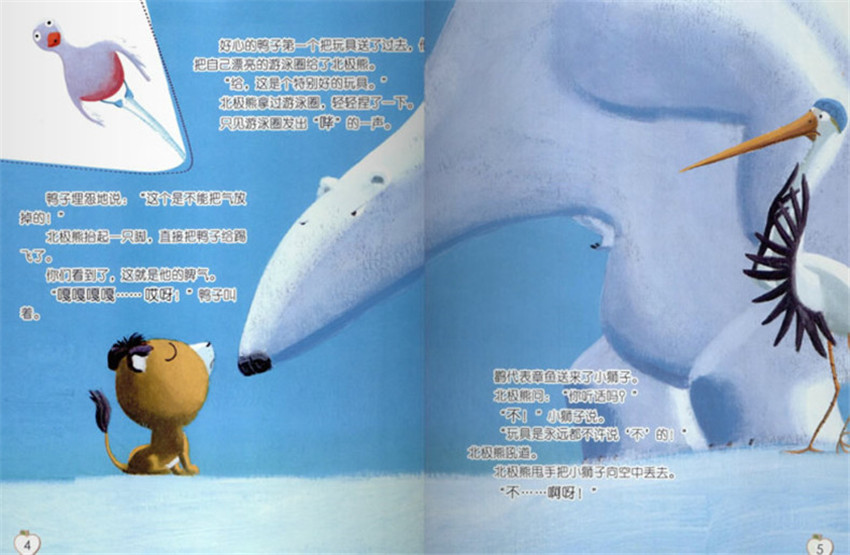 好心的鸭子及时一个把玩具送了过去,把自己漂亮的游泳圈给了北极熊,“给,这是个特别好的玩具,北极熊拿过游泳圈,轻轻捏了一下。只见游泳圈发出“哔”的声。鸭子埋怨地说:“这个是不能把气放掉的,北极熊抬起一只脚,直接把鸭子给踢飞了,你们看到了。这就是他的脾气。“嘎嘎嘎嘎..哎呀1”鸭子叫着。