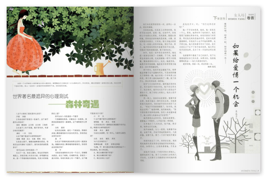 一本贴心的全新两性期刊,在广大读者心目中有着不可替代的位置,时尚、新潮、精美、典雅,鲜明的个性和不俗的亲和力,使一批又一批读者成为自己的朋友,真的应了原来刊物扉页的一句话;"你我一次偶然,将会成为永远"。是女性朋友值得信奈的好朋友,定位为18-40岁的女性读者,倡导自尊、自爱、自信、自立、自强的新时代女性精神,深受广大读者的推崇和喜爱。