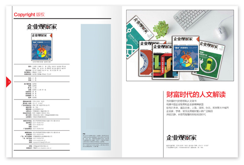 《企业观察家》杂志聚焦经济动态,揭示深层财经问题,交流企业界经营管理之道,反映企业界丰富人生,书写企业家智慧,搭建中国企业发展智库。,弘扬市场人文关怀,在激励人们创造、追求财富的同时,倡导有价值的商业文明和商业精神,建设中国企业的商业规则和商业价值体系。