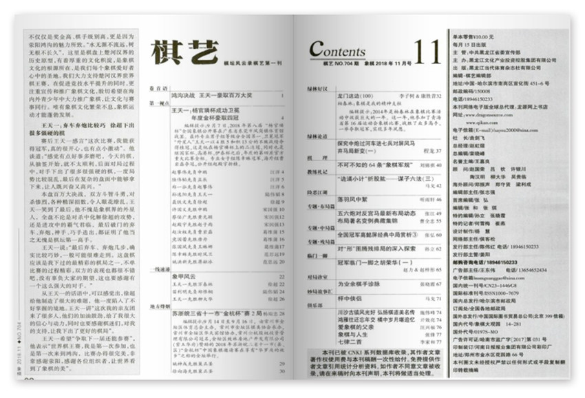 精彩的内容、专业的观点、精美的图片、高品位的审美情趣,随着读者的物质生活水准迅速提升,人们越来越注重精神层面的追求与生活品质的提升,《《棋艺》顺应时代潮流的一个全方位整合出击。集趣味性、思想性和知识性于一体,是一本越来越有看点的杂志、一本越做越精彩的杂志、一本越来越受欢迎的杂志,在全国范围内具有较高的知名度和广泛的社会影响。