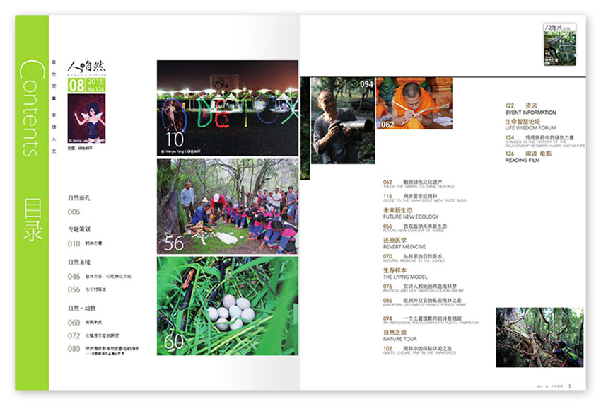 《人与自然》主要栏目:专题策划、卷首语、自然的生命、民族民俗、生存样本、智慧古鉴等。