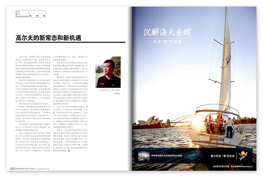 目前少数在全国范围发行、具有高度专业水准的高尔夫杂志,与英国"GOLFPUNK"杂志版权合作,高尔夫运动也在逐渐摆脱贵族”的误解,开始"飞入寻常百姓家”,以各种形式进入公立学校的课程中,被广大青少年学生所了解,去妖魔化,被社会广泛了解,这些也都是高尔夫的新常态和新机遇。
