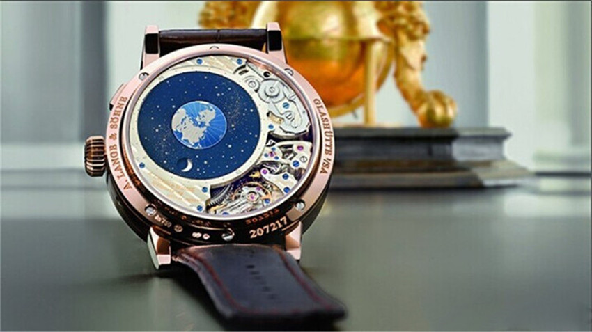 月球装置显示装饰华丽,不仅呈现当前的月相,更展现月球对应太阳的位置及在夜空中运行的轨迹。RICHARDLANGEPERPETUALCALENDAR“Terraluna”的专利轨迹月相显示同样是精密制表领域的创新杰作。此无比的装置,描绘月球对应地球和太阳的不断变化的位置关系。