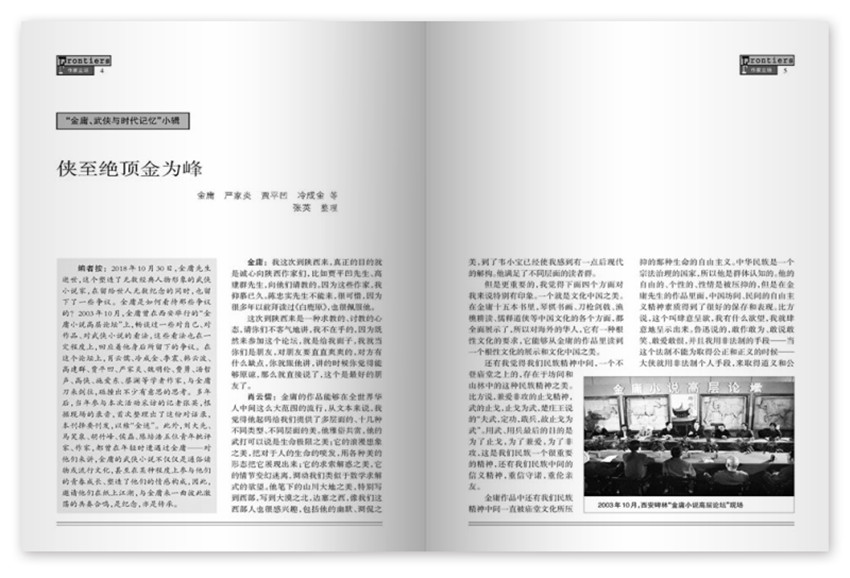 侠至绝顶金为峰,金庸:我这次到陕西来,真正的目的就是诚心向陕西作家们,比如贾平凹先生、高建群先生,向他们请教的。因为这些作家,我仰慕已久。陈忠实先生不能来,很可惜,因为很多年以前拜读过《白鹿原》,也很佩服他。这次到陕西来是一种求教的、讨教的心态,请你们不客气地讲,我不在乎的,因为既然来参加这个论坛,就是给我面子,我就当你们是朋友,对朋友要直直爽爽的。