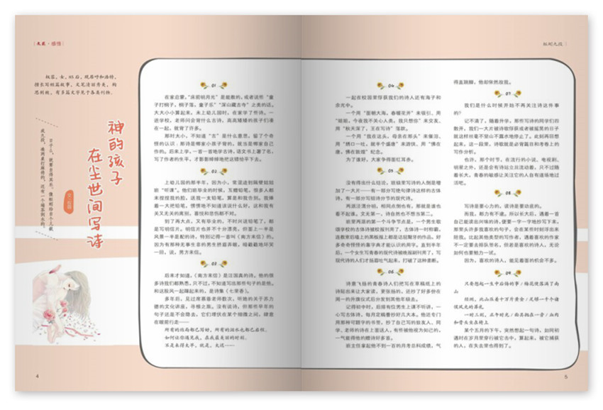 神的孩子在尘世间写诗,在家启蒙,“床前明月光”是能教的,或者说些“童子打桐子,桐子落,童子乐”“深山藏古寺”之类的话。大大小小算起来,未上幼儿园时,在家学了些诗。一进学校,老师问会背什么古诗,高高矮矮的孩子们凑在一起,就背了许多。那时太小,不知道“古”是什么意思,留了个奇怪的认识:那诗是哪家小孩子背的,就当是哪家自己作的。