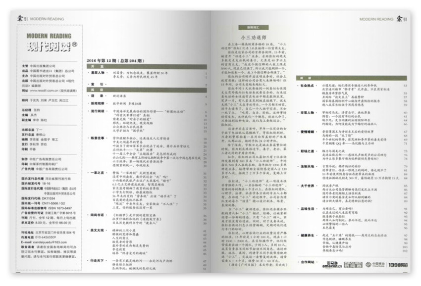 《现代阅读》,单期页数:96页,本刊创刊于:2006年,其纸张开本为:16开,本刊重在突出理论性和探索性,对促进文学文摘交流及发展,起着重要的指导作用。主要栏目有:新闻观察、流行阅读、陈景往事、职场之道、大千世界、品味生活、健康养生等栏目。