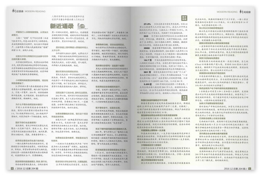 精彩的内容、专业的观点、精美的图片、高品位的审美情趣,随着读者的物质生活水准迅速提升,人们越来越注重精神层面的追求与生活品质的提升,《现代阅读》顺应时代潮流的一个全方位整合出击。从精品和热销的图书中选摘精彩的内容,用书摘的形式传递书讯,根据新闻出版总署“走出去”的要求,与美国的北美网达成了《现代阅读》中文书摘电子图文数据提供协议。