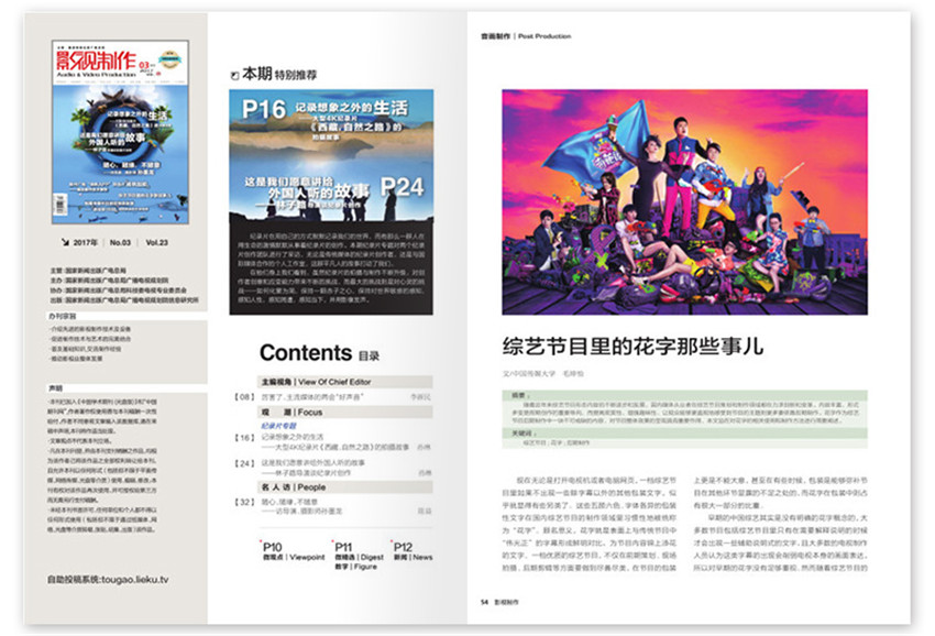 《影视制作》精心制作,提高节目的审美效应:电视节目有着独特审美功能和审美价值。我们在观看节目的,有的节日给人的心灵以一种强大的震撼力,有的节目使人感到轻松愉快、妙趣横生,这说明受众受到强烈的美的感染。单期页数:92页,本刊创刊于:1994年,其纸张开本为:16开,本刊重在突出理论性和探索性,对促进影视制作业交流及发展,起着重要的指导作用。
