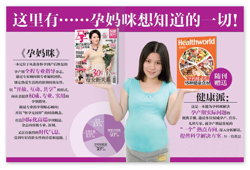 《孕妈咪》杂志锁定热爱生活的育龄期时尚女性,以“开放、互动、共享”的形式,向读者提供、专业、实用的孕期指导,做最专业的孕期贴心顾问;并以“怀孕无国界”的时尚概念,打造国际化高端孕刊精品。杂志内容既专业、深刻,又富有强烈的时代气息,受到年轻育龄女性的喜爱和追随。
