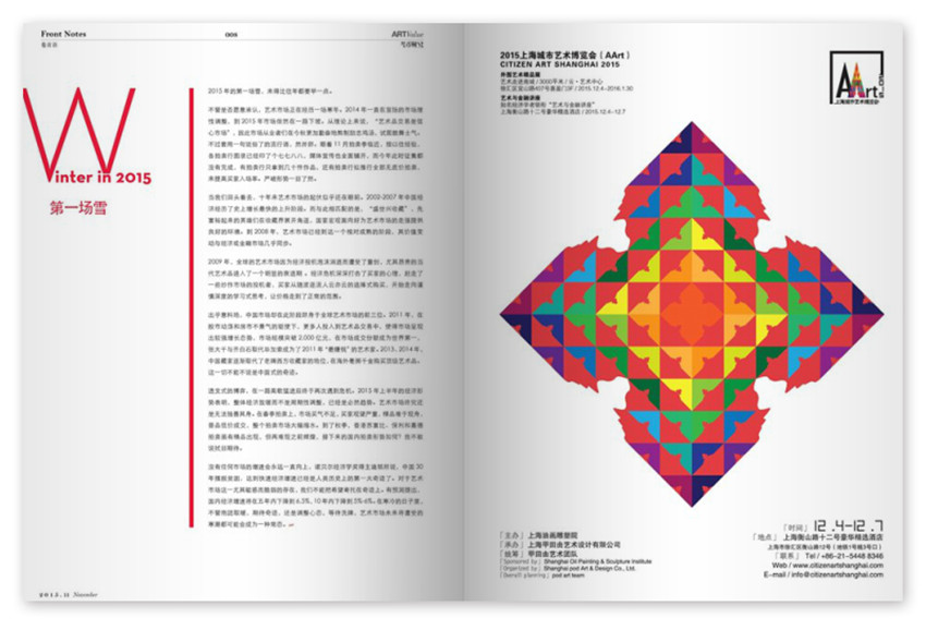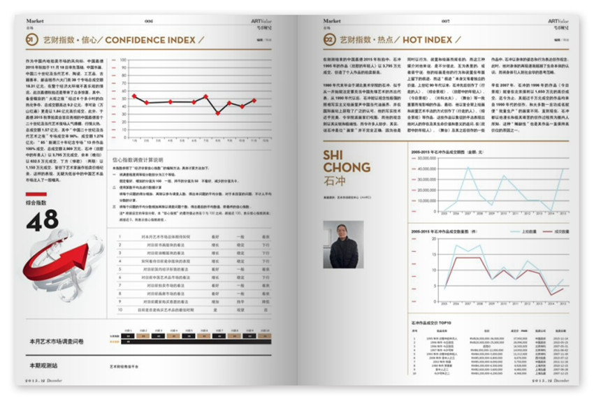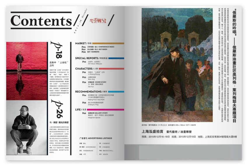 一本顺应艺术市场需求,从全新角度打造的艺术市场媒体,杂志拥有卓尔不群的品质、优雅的阅读感受,和国内强的艺术市场分析实力,通过各大拍卖公司、酒店、机场、书店等渠道,发行量迅速攀升,是国内及时本为高端阶层服务的艺术类专业杂志,坚持较高编辑标准,出品人于天宏涉足当代艺术十几年,先后任国内数家知名传媒公司高管,积累了丰富的传媒经验和深厚的艺术人脉。