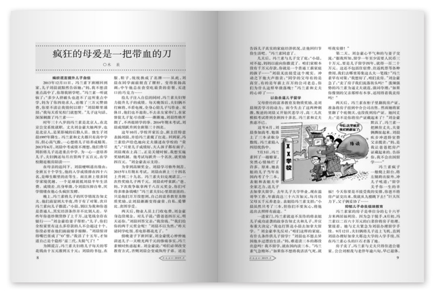 疯狂的母爱是一把带血的刀,编织谎言提升儿子自信,2013年12月11日,冯兰素下班刚回到家,儿子刘晨就黯然告诉她:“妈,我不想读重点高中了,你帮我转学吧。”冯兰素一听就恼了:“多少人挤破头也进不了这所重点中学,妈为了你四处求人,还缴了三万元赞助费,你要不读让我情何以堪?”刘晨眼里涌泪:“我每天看见校门就想哭。”