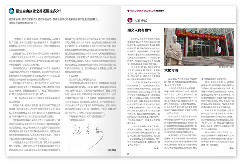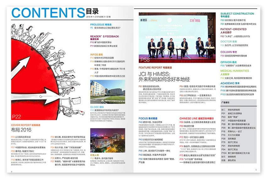 杂志报道围绕国家医改政策深度解读传递、基层医疗卫生改革政策解读、各地县区医院改革试点案例分享、医院管理经验交流、对话县域医疗卫生主管领导。