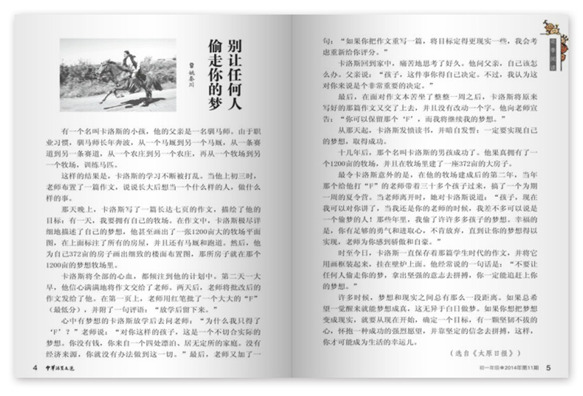 别让任何人偷走你的梦,有一个名叫卡洛斯的小孩,他的父亲是一名驯马师。由于职业习惯,驯马师长年奔波,从一个马厩到另一个马厩,从一条赛道到另一条赛道,从一个农庄到另一个农庄,再从一个牧场到另一个牧场,训练马匹,这样的结果是,卡洛斯的学习不断被打乱。当他上初三时,老师布置了一篇作文,说说长大后想当一个什么样的人,做什么样的事。
