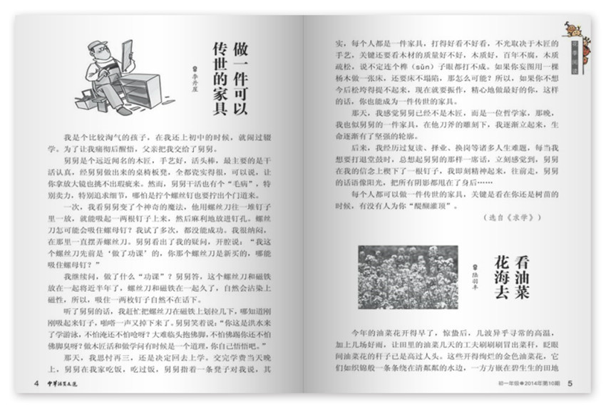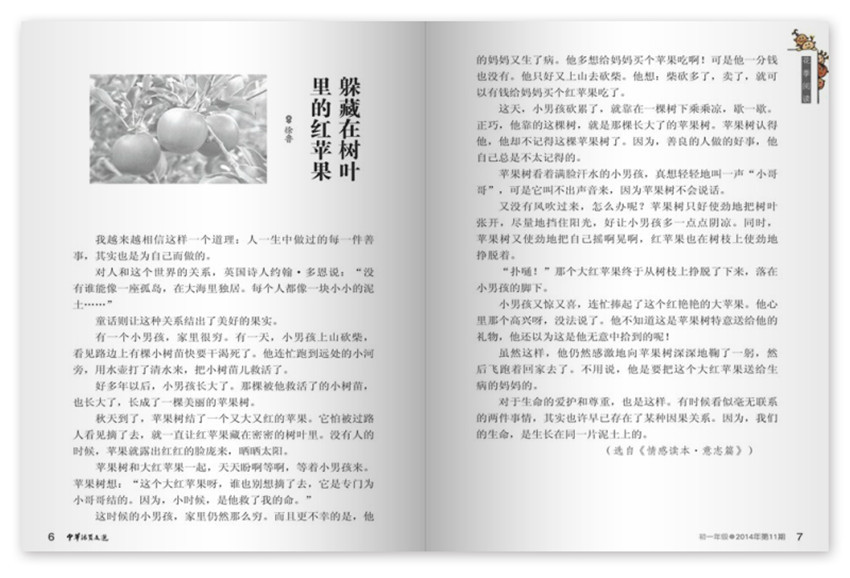 设有课外阅读积累、中华国学普及、课堂教学拓展、中高考备考和学生习作展示等板块,以优美、正面、高品质的选文在中小学师生中具有良好口碑,以普及传统文化为特色,以提升文化素养为目标,分为小学版,初一年级,初二年级,初三年级,高一年级,高二、高三年级和教师版七个版别,供相应读者选择,主要栏目:花季阅读、中华国学、我写故我在、叙事类记叙、文桥阅读、新题演练等。