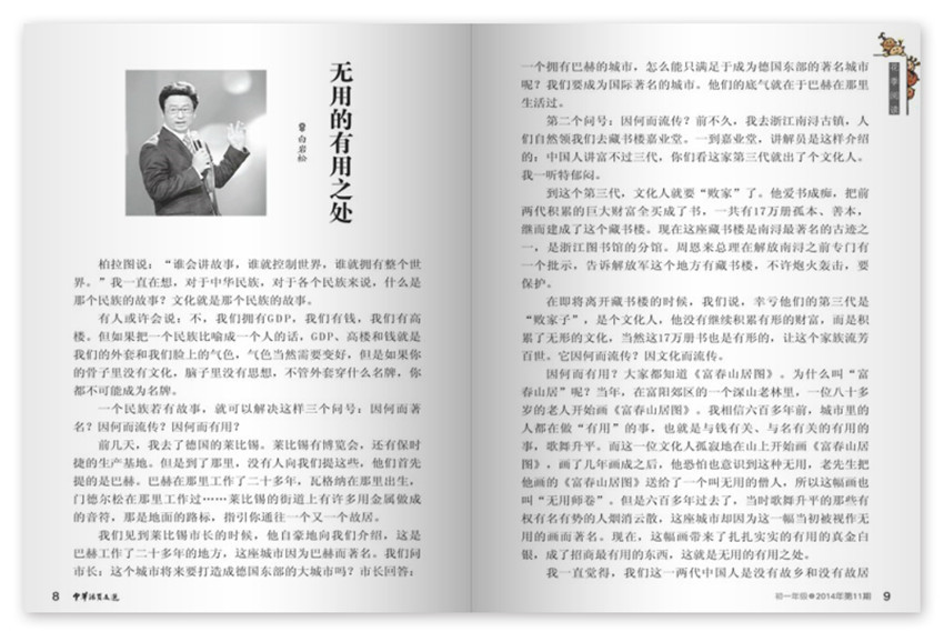 无用的有用之处,柏拉图说:“谁会讲故事,谁就控制世界,谁就拥有整个世界。”我一直在想,对于中华民族,对于各个民族来说,什么是那个民族的故事?文化就是那个民族的故事,有人或许会说:不,我们拥有GDP,我们有钱,我们有高楼。但如果把一个民族比喻成一个人的话,GDP、高楼和钱就是我们的外套和我们脸上的气色,气色当然需要变好,但是如果你的骨子里没有文化,脑子里没有思想,不管外套穿什么名牌,你都不可能成为名牌。