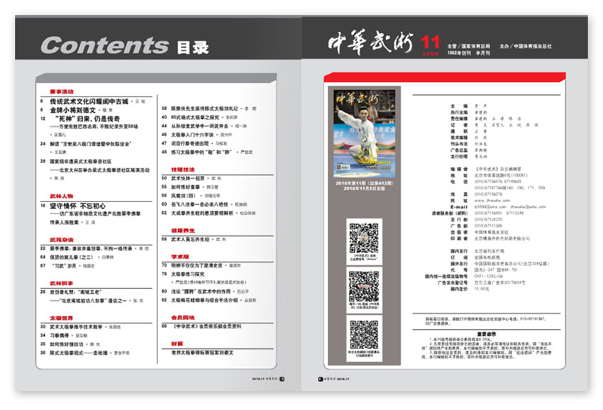 在《中华武术》创刊37周年岁末,《中华武术》主办了“中国太极拳最具影响力人物”评选活动,活动支持单位为四川省体育彩票管理中心和重庆市体育彩票管理中心。经过网络投票和专家评委的评定。武者仁心,胸藏万汇,在拳脚中承载和感悟武术的华美与厚重。