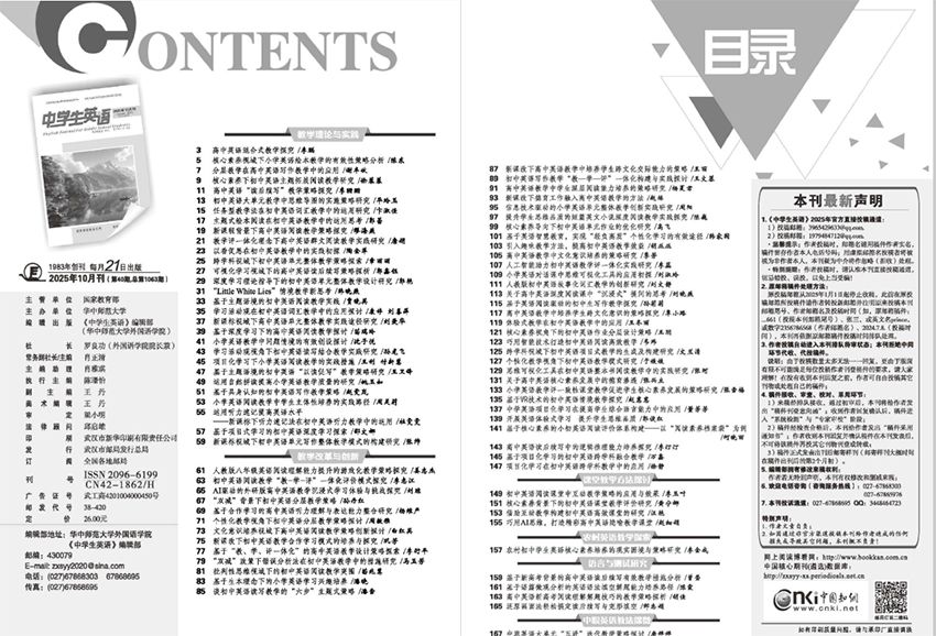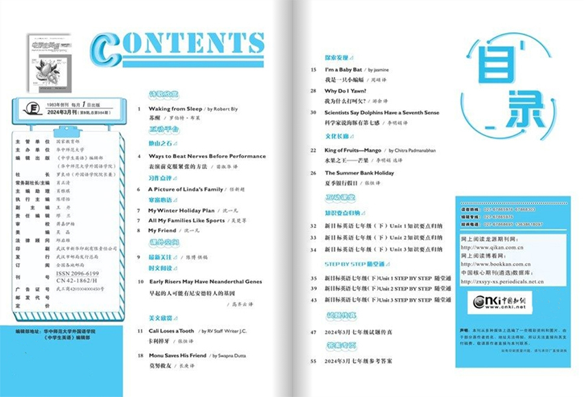 该刊连续入选“中国优秀少儿报刊”,是国家新闻出版总署检测质量优秀刊物,文章被中国知网、万方数据等权威数据库全文收录。它不仅是学生提升英语成绩的实用工具,更是培养跨文化交际能力的重要载体,持续以专业性与创新性引领中学英语辅助学习新潮流,成为师生信赖的“第二课堂”。