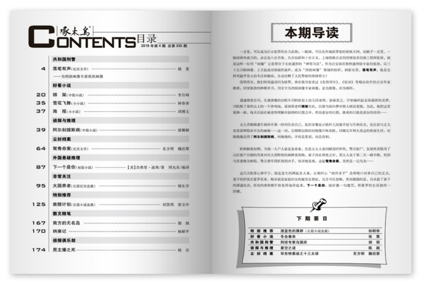 《啄木鸟》主要栏目:特别推荐、大案要案、好看小说、侦探与推理、尘封档案、外国推理探索等。