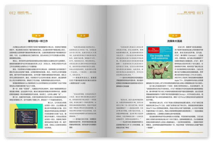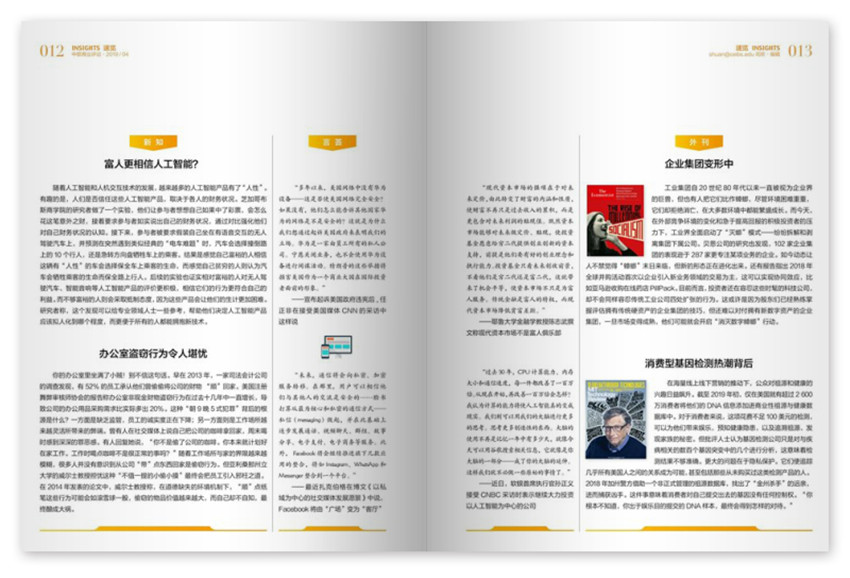 《中欧商业评论》主要栏目:新知、卷首语、管理时评、理念、封面、案例等。