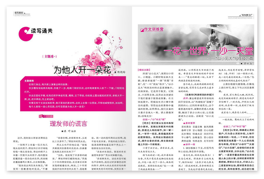 目标明确,成为作文技法指导与素材供应平台,汇聚名师,依托全国作文名师考研中心,汇集名师,成就作文期刊;主要栏目:作家零距离、写作梦工厂、佳作现场、读写通关、素材库、好书新荐等。